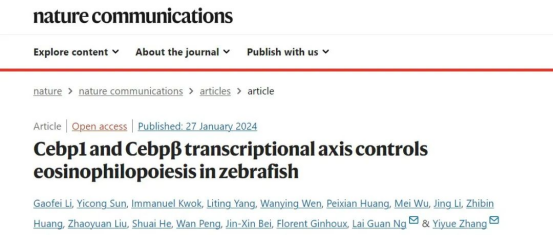 2024年1月27日,本课题组与华南理工大学张译月课题组联合在Nature Communications上发表题为“Cebp1 and Cebpβ transcriptional axis controls eosinophilopoiesis in zebrafish”的研究论文,用斑马鱼模型揭示了嗜酸性粒细胞的时空发育模式、谱系特征及调控机制。