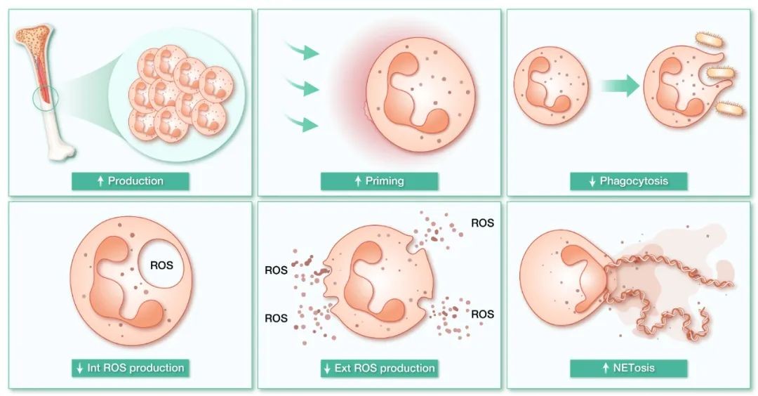 图1 论文标题及作者信息 中性粒细胞的基本特性及其代谢机制 中性粒细胞作为血液中数量最丰富的白细胞,其免疫功能呈现独特的双向调控特性。传统理论将其迁移过程视为由血液至组织的“单程旅行”,但近年研究揭示其具备反向跨内皮重返血液循环的能力,这种动态迁移模式与其功能异质性密切相关。不同表型的中性粒细胞既可通过释放细胞因子构建免疫防御网络,又可能因表型极化导致远端器官损伤或全身免疫抑制,这种可塑性使其在急性炎症中发挥核心作用,同时,其在慢性炎症中的具体作用机制也成为研究热点。 代谢可塑性是中性粒细胞适应复杂生理病理环境的关键特征。传统观点认为其仅依赖糖酵解供能,但多组学研究证实其能量代谢网络具有显著适应性:葡萄糖通过糖酵解和磷酸戊糖途径同时满足能量需求与效应分子合成,而脂肪酸氧化则作为应激状态下的能量补充。这种代谢灵活性受局部微环境调控,肿瘤微环境甚至能诱导其功能重编程,表明其与慢性炎症疾病及肿瘤免疫逃逸的深层关联。 中性粒细胞的发育多样性与功能复杂性不断革新传统认知。从骨髓粒-单核祖细胞分化而来的中性粒细胞,在发育过程中形成表型功能各异的亚群,其效应特征既受局部刺激信号塑造,也与特定亚群招募机制相关。NLRP3炎症小体作为先天免疫压力感受器,不仅调控促炎细胞因子分泌,更通过介导细胞焦亡影响免疫应答走向。这种从发育到功能的动态调控网络,为理解中性粒细胞在免疫稳态维持与疾病发生发展中的作用机制提供了全新维度。