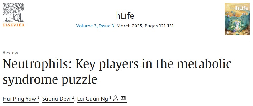 Lai Guan Ng 资深研究员 通讯作者 机构:上海市免疫治疗创新研究院 研究方向:固有免疫,包括髓系细胞在稳态下和病理状态下的功能和机制 引用格式:Yaw HP, Devi S, Ng LG. Neutrophils: Key players in the metabolic syndrome puzzle. hLife 2025; 3: 121–131.
