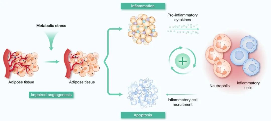 图2 代谢综合征对中性粒细胞效应功能的调控机制 中性粒细胞与脂肪组织互作机制及代谢调控 肥胖作为由能量过剩引发的代谢紊乱,其病理核心在于脂肪组织(AT)异常扩张及功能失调。内脏脂肪因解剖位置邻近代谢调控枢纽器官,其过度蓄积可通过内分泌功能异常加剧全身代谢紊乱:肥胖个体AT中促炎因子如肿瘤坏死因子-α(TNF-α)和白介素-6(IL-6)分泌增加,而具有胰岛素增敏作用的脂联素水平下降,这种脂肪因子失衡直接参与造成了葡萄糖耐受不良和胰岛素抵抗。与此同时,AT为应对营养过剩会通过脂肪细胞肥大与增生进行适应性脂质储存,但快速扩张常伴随血管生成滞后,导致组织缺氧、细胞死亡及促炎因子瀑布式释放,形成慢性低度炎症微环境(图3)。 中性粒细胞在此病理过程中发挥关键介导作用,其与脂肪细胞的交互作用构成肥胖相关的代谢紊乱的恶性循环。早期阶段,中性粒细胞被招募至AT后通过释放弹性蛋白酶破坏胰岛素信号通路关键分子,同时促进巨噬细胞浸润加剧炎症;脂肪细胞脂解产生的游离脂肪酸则通过白三烯B4依赖性机制强化中性粒细胞-巨噬细胞串扰。值得注意的是,中性粒细胞介导的AT炎症存在物种特异性差异:小鼠模型显示非NLRP3依赖性IL-1β上调,而人类研究证实NLRP3炎症小体活化直接参与AT纤维化进程。这种代谢——免疫交互网络的复杂性说明,靶向中性粒细胞代谢重编程或成为改善肥胖相关代谢综合征的新策略。