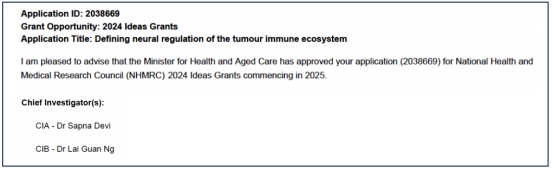 上海市免疫治疗创新研究院 Shanghai Immune Therapy Institute 近日,上海市免疫治疗创新研究院资深研究员Lai Guan Ng(黄来源)教授与澳大利亚墨尔本大学杜赫提研究所的Sapna Devi博士共同开展的课题《解析肿瘤免疫生态系统的神经调控机制》(Defining Neural Regulation of the Tumour Immune Ecosystem)成功荣获澳大利亚国家健康与医学研究委员会(NHMRC)颁发的最新一轮创新资助计划。该资助计划为期四年,旨在支持两国科研团队在医学领域的前沿研究。 肿瘤免疫生态系统的复杂性和多样性使得其神经调控机制成为当前医学研究的重要课题。该项目为肿瘤治疗提供了新的思路和方法,这不仅有助于提升肿瘤治疗的疗效和安全性,还有望为医学科学的发展做出重要贡献。