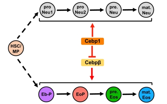 既往对于嗜酸性粒细胞发育及调控的理解主要来自哺乳动物模型的成体造血:功能性嗜酸性粒细胞由骨髓来源的嗜酸性粒系决定祖细胞(EoP)逐级分化成熟[1]。在本研究中,我们借助造血系统与哺乳动物非常相似的斑马鱼模型,从发育早期到成体解析嗜酸性粒细胞的发育特点及调控机制。 首先,我们鉴定了斑马鱼嗜酸性粒细胞谱系的特异性分子标志物eslec,构建了转基因报告品系Tg(eslec:eGFP)斑马鱼品系,对嗜酸性粒细胞的发育进行整体成像发现,在斑马鱼出生后5天嗜酸性粒细胞开始产生并逐渐增多,且主要分布在肾髓(相当于哺乳类的骨髓)、腹腔液、肠道等组织中,展示了嗜酸性粒细胞的早期时空发育模式。 随后,我们利用单细胞测序技术(ScRNA-Seq)将嗜酸性粒细胞谱系分为祖细胞(EoP)、前体细胞(pre.Eos)及成熟细胞(mat.Eos)三种亚群,解析了嗜酸性粒细胞的谱系特征:EoP具备较为活跃的增殖性;pre.Eos中主要富集了核糖体、蛋白修饰与氧化磷酸化的相关通路,可能与大量合成颗粒蛋白有关;mat.Eos表达更多的免疫相关基因。 紧接着,我们进一步探究了Cebp分子对嗜酸性粒细胞谱系发育的层级调控机制,并比较了Cebp调控粒系造血作用物种之间的保守性和差异性。研究结果揭示了斑马鱼Cebp1-Cebpβ转录调控轴在嗜酸性粒细胞谱系发育中的精细作用机制:Cebp1能够抑制嗜酸性粒细胞的谱系决定,并可能影响前体细胞的分化;Cebpβ通过促进嗜酸性粒细胞的谱系决定及pre.Eos分化。研究还发现,人类C/EBPeP27蛋白与斑马鱼Cebp1的功能类似,能在斑马鱼中抑制嗜酸性粒细胞的发育,斑马鱼Cebp1与人类的C/EBPeP27在调控嗜酸性粒细胞发育方面是保守的。